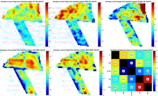 Field F2 average z-scores from images specified by the selection criteria for the different sensors (field plots), and corresponding correlations of these images between the different sensors (bottom right). Correlation coefficients are displayed in each cell, and diagonal values were omitted and colored black. The north direction is up, and the field spans approximately 1.4 km northward by 1.7 km eastward.