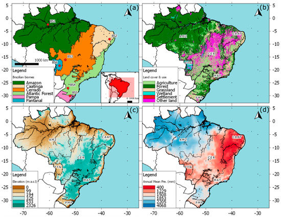 Geographical location of the study area: (a) Brazil’s main biomes: AMZ, Amazônia; CER, Cerrado; MAT, Mata Atlântica; CAAT, Caatinga; PTN, Pantanal; and Pampa, PMP. (b) Land cover for 2015 derived from the Land Cover-Climate Change Initiative (LC-CCI) product (source: http://maps.elie.ucl.ac.be/CCI) [57]. (c) Brazil’s terrain elevation. Elevation based on 250-m Digital Elevation Model—Shuttle Radar Topographic Mission (DEM-SRTM) images (source: https://earthexplorer.usgs.gov) [58]. (d) Mean annual rainfall derived from ground-based gridded rainfall dataset developed by Xavier et al. [59] (period: 1980–2015).