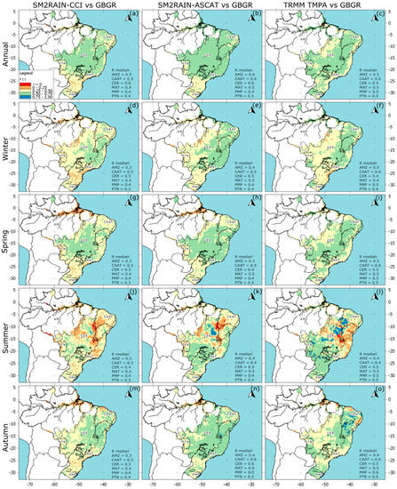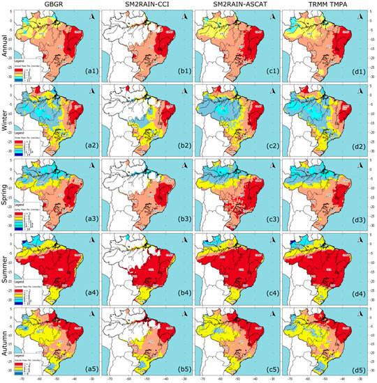From a broad perspective, the three SPPs captured the temporal dynamics of the in situ daily and seasonal rainfall relatively well (see Figure 5), but tended to fail to estimate the amount of rainfall (see Figure 6), mainly in those regions dominated by a semiarid climate at the CAAT and CER biomes (in particular, SM2RAIN-CCI and SM2RAIN-ASCAT) and in coastal areas of the NEB (in particular, TRMM TMPA). These results are in good agreement with those shown by Paredes-Trejo et al. [30], who found that SM2RAIN-CCI (version 1.0) exhibits this same feature over most of Northeastern Brazil (particularly, in the Sertão region). In general, SM2RAIN-CCI and TRMM TMPA tended to show slightly better agreement with the gauge-based data in different seasons relative to the SM2RAIN-ASCAT rainfall product (Figure 4 and Figure 6). This can be partially explained by the fact that very likely, some of the rain gauges from the GPCC-FDD data used during the stage of calibration and bias correction of both SM2RAIN-CCI and TRMM TMPA have also been used for developing the GBGR dataset, resulting lower bias magnitudes than that obtained with SM2RAIN-ASCAT.