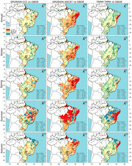 The percent bias derived from the SM2RAIN-CCI rainfall product against the GBGR dataset, the SM2RAIN-ASCAT rainfall product against the GBGR dataset, and the TRMM TMPA rainfall product against the GBGR dataset for: (a,b,c) annual; (d,e,f) winter; (g,h,i) spring; (j,k,l) summer; and (m,n,o) autumn during 2007–2015. Whited cells in the panels are as per Figure 4. For each product and season, the median value per biome is reported.