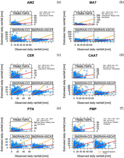 Daily rainfall estimates from TRMM TMPA, SM2RAIN-CCI, and SM2RAIN-ASCAT products against in situ daily rainfall from the GBGR dataset located in the biomes: (a) AMZ; (b) MAT; (c) CER; (d) CAAT; (e) PTN; and (f) PMP during the period during 2007–2015. The orange line indicates 1:1 correspondence and red line gives the linear regression best fit. The BS1, BS4, BS3, BS2, BS6, and BS5 benchmark sites shown in Figure 1a provided the in situ rainfall data for AMZ, CAAT, CER, MAT, PMP, and PTN, respectively.