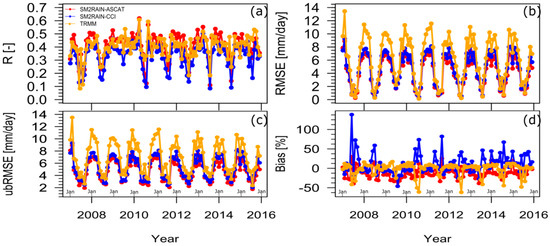 Monthly time series for: (a) R (dimensionless); (b) RMSE (mm/day); (c) ubRMSE (mm/day); and (d) B (%) derived from the SM2RAIN-ASCAT rainfall product against the GBGR dataset (red line), the SM2RAIN-CCI rainfall product against the GBGR dataset (blue line), and the TRMM TMPA rainfall product against the GBGR dataset (orange line) for all-Brazil during the period 2007–2015.