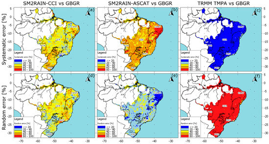 Spatial distributions of systematic [%] and random [%] error components across Brazil from: (a,d) the SM2RAIN-CCI product; (b,e) the SM2RAIN-ASCAT product; and (c,f) the TRMM TMPA product against the GBGR dataset for 2007–2015. Whited cells for all products are as per Figure 4.