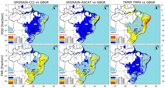 Spatial distributions of the POD [fraction] and FAR [fraction] across Brazil from: (a,d) the SM2RAIN-CCI product; (b,e) the SM2RAIN-ASCAT product; and (c,f) the TRMM TMPA product against the GBGR dataset for 2007-2015. Whited cells for all products are as per Figure 4. POD and FAR are calculated with a threshold of 1 mm/day.