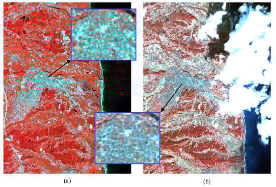 Two ASTER images taken on (a) July 2010 and (b) November 2010. Image (a) was taken in sunny conditions that caused much higher pixel values for urban area pixels (zoomed) than for image (b). For example, the value of the same pixel of this area is equal (83, 185, 126) for (a) and (37, 63, 81) for (b). Moreover, a great part of image (b) is covered by clouds and their shadow.