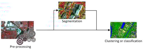The analysis of a satellite image can usually be decomposed into 2 or 3 steps as shown in Figure 2: (1) The pre-processing step during which the image is prepared from raw sources (merging pictures, orthorectification, etc.) to solve the fore-mentioned problems; (2) an optional segmentation step that consists of grouping together adjacent pixels which are similar given a certain homogeneity criterion. These groups, called segments, should ideally be a good estimation of the objects presents in the image [,]; (3) Either the raw image or the segments created during step 2 can then be fed to a supervised or unsupervised machine-learning algorithm in order to recognize and classify the elements of the image.