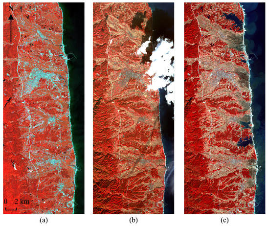 The optical images we use are from 19 March 2011, 29 November 2010 and 7 July 2010 (Figure 6), see Table 1 for their detailed characteristics. We use two images before disaster because the closest image taken on November 2010 has high percent of cloud coverage above the potentially damaged area, though it has a lower variance of seasonal changes compared with the image taken on July 2010. For this reason, we use both “before” images for change detection and we combine the two results by replacing the masked area of the November 2010 image results by the results obtained with the image taken on July 2010.