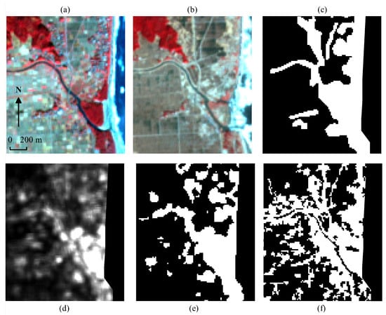 Change detection results. (a) image taken on 7 July 2010, (b) image taken on 19 March 2011, (c) ground truth, (d) average RE image of the proposed method, (e) proposed method CM, (f) RBM.
