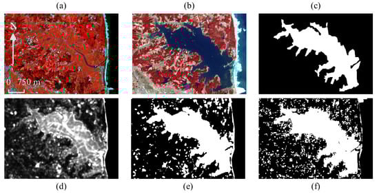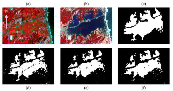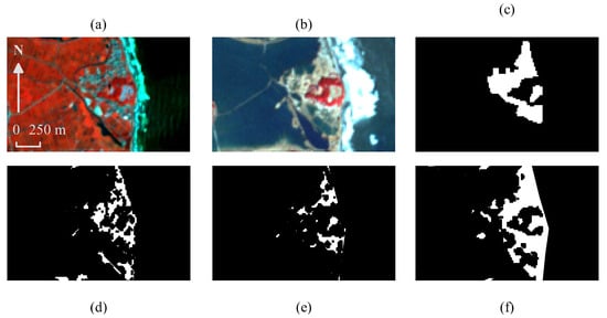Clustering results, flooded area. (a) image taken on 7 July 2010, (b) image taken on 19 March 2011, (c) ground truth, (d) K-Means on subtracted image, (e) K-Means on concatenated encoded images, (f) DEC on concatenated encoded images.