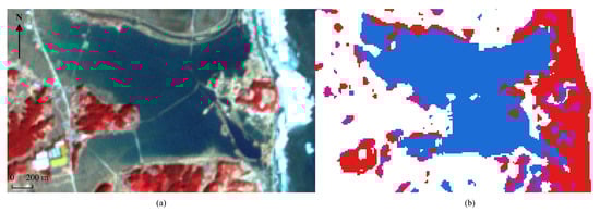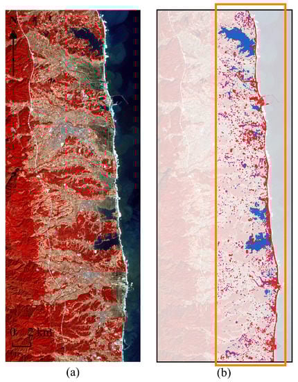 In Table 3, we show the performance of our proposed method and the RBM method on the north and south area of the image. We compute the precision (Equation (2)), recall (Equation (3)), accuracy (Equation (4)) and Cohen’s Kappa score [] for both methods depending on whether or not they correctly identified change area based on the ground truth. Once again, the ground truth did not include shoreline damages which may result in slightly deteriorated indexes for both algorithms.