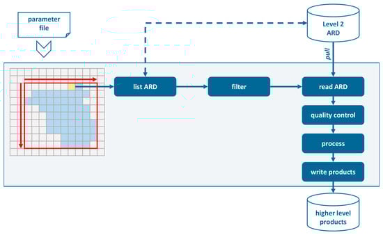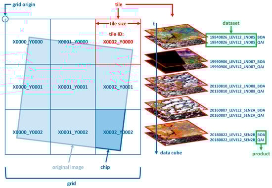 Remote sensing products are grouped in a hierarchical classification scheme []. The lowest available level is commonly Level 1, i.e., radiometrically calibrated and georectified data. Level 2 data most notably include some sort of atmospheric correction. Level 3 data are temporal Level 2 aggregates that are provided in a different spatial reference, commonly a grid system with a single coordinate system. Level 4 products are model output, often derived from multi-temporal or multi-sensor measurements. In this paper, Levels 1 and 2 are referred to as lower-level products and Levels 3 and above as higher-level products, respectively. Several modifications to this scheme are commonly used. As an example, Level 3 products are the first that are mapped on a regular grid, whereas the lower-level products are still in georectified swath geometry (e.g., the Landsat Worldwide Reference System 2 (WRS-2) path/row system). In contrast, the key element of ARD is to provide gridded data [,,]—regardless of product level. This is for e.g., reflected in ESA’s production and distribution strategy of Sentinel-2 data as they already include gridding on Level 1 []—although still using local Universal Transverse Mercator (UTM) zones with a substantial amount of redundant data between overlapping and neighboring tiles.