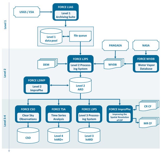 FORCE is organized in several software components. Figure 2 summarizes all available modules and their placement in the level system. A typical FORCE workflow as depicted in Figure 2 consists of following main steps: (i) Level 1 images are acquired from the space agencies, and are (ii) converted to Level 2 ARD, which are (iii) aggregated and analyzed using several higher-level modules. More detailed descriptions of the individual components will be given in the following sections, mainly ordered by level.