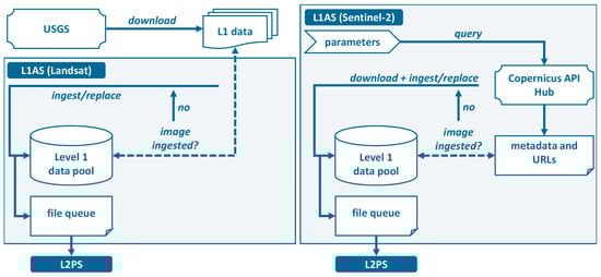The FORCE Level 1 Archiving Suite (L1AS) assists in acquiring and managing Level 1 data. L1AS has two different routines for Landsat and Sentinel-2, respectively (Figure 3). The main difference is that Landsat data need to be downloaded manually, while Sentinel-2 images are automatically retrieved by FORCE.
