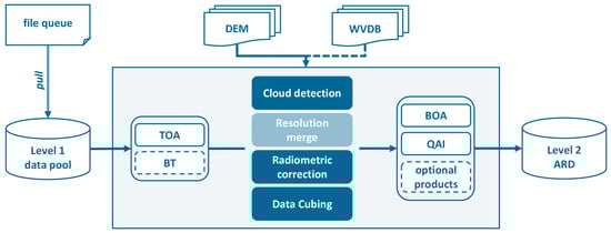 The FORCE Level 2 Processing System (FORCE L2PS) generates harmonized, standardized, and radiometrically consistent Level 2 products with per-pixel quality information, i.e., analysis ready data. L2PS pulls each enqueued Level 1 image and processes it to ARD specification. Each image (box in Figure 4) is processed independently using multiprocessing []. The pipeline is memory resident to minimize input/output (I/O), i.e., input data are read once, and only the final, gridded data products are written to disc.