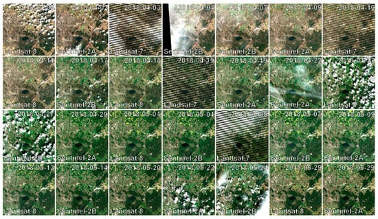 Data cube of Landsat 7/8 and Sentinel-2 A/B Level 2 ARD for Southeast Berlin, Germany. A two-month period of true color image chips for one 30 × 30 km tile is shown.