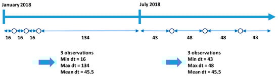 FORCE clear sky observations (FORCE CSO) mines data availability (Figure 7), e.g., to make informed decisions about the parameterization or applicability of a specific method, or to identify areas where commissions errors reduce the amount of usable data []. Clear sky observations are defined in response to the quality control settings. For a given time period (in years) and interval (months), the number of clear sky observations are counted, and statistics on the temporal difference between clear sky observations are calculated; currently available statistics are the average, standard deviation, minimum, maximum, range, skewness, kurtosis, median, 25/75% quantiles, and interquartile range. The beginning and end of the intervals act as boundaries for this assessment. This processing scheme reflects the fact, that a single measure of data availability might not yield representative results. As an example (Figure 7), data availability for the first and second half of 2018 is equal in terms of the number of observations and the average time between observations. However, there are large differences in the maximum difference as data are clumped in the first half. This has important implications, e.g., for the detectability of harvesting events.