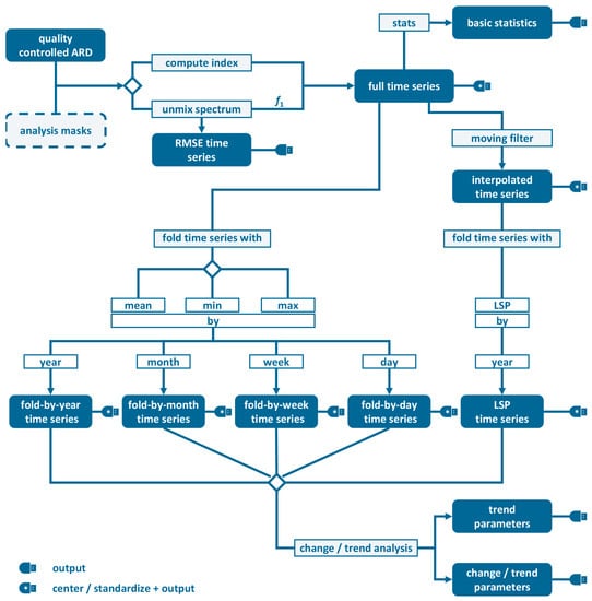 Processing is based on a spectral band (Table 1), spectral index (e.g. NDVI, for a full list see []), or fractional cover (using linear spectral mixture analysis [] with custom endmembers). The full time series (limited by temporal filters, see Section 3.3.1) is generated, quality-controlled, and potentially output. The time series may be centered and/or standardized each pixel’s mean and/or standard deviation before output as indication for vegetation under-/over-performance. A basic summary of the full time series can be generated, which includes per-pixel mean, standard deviation, minimum, and maximum.