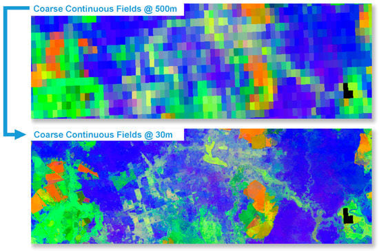 FORCE ImproPhe (Improving the spatial resolution of land surface Phenology) increases the spatial resolution of coarse continuous fields (example: Figure 12). It was originally developed to increase the spatial resolution of coarse resolution MODIS phenometrics, using Landsat ARD as multi-temporal prediction targets []. The fusion intensively uses the information from the local pixel neighborhood at both resolutions, wherein sparser medium resolution data are used to disentangle the land surface phenology by employing textural and spectral homogeneity metrics. ImproPhe is useful (i) in areas or times when Landsat/Sentinel-2 data are not dense enough to derive land surface phenology directly, and (ii) in areas where inter-annual climate variation prevents the strategy of pooling multiple years to increase data density. In general, ImproPhe can be applied to any coarse continuous field, provided a link to spectral–temporal land surface processes exists.