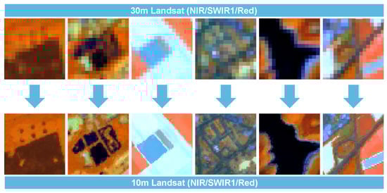 Landsat ARD at original 30 m resolution (top), and Landsat ARD with improved spatial resolution at 10 m (bottom) for image subsets from North Rhine Westphalia, Germany. Using the FORCE L2IMP module, the spatial resolution was enhanced using multi-temporal Sentinel-2 A/B prediction targets.