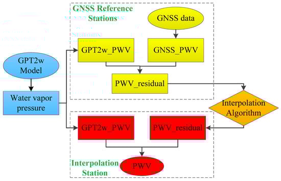 In this paper, the global pressure and temperature 2 wet (GPT2w) model built on ERA-Interim data was used to estimate the approximate PWV []. The residual term, namely the difference of PWV derived from GNSS and the GPT2w model, was interpolated by the algorithm above-mentioned. In this method, there is no need for any meteorological data at the interpolation point and the long-term regression analysis of observation data. It was found that the proposed method had a good performance for the interpolation points that were far from the elevation range of the reference stations, which is a significant advantage over the traditional methods above-mentioned.
