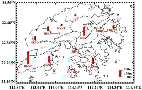 This study utilized GNSS and the surface meteorological data of the Hong Kong Satellite Positioning Reference Station Network (SatRet) provided by the Hong Kong Geodetic Survey Services, which were freely downloaded via their website (www.geodetic.gov.hk). The GNSS data of 12 stations with a sampling rate of 30 s, and the surface meteorological data including temperature, pressure and relative humidity were downloaded. As shown in Figure 2, the area covered by those stations was 113.89°–114.34° for longitude and 22.21°–22.50° for latitude, respectively. The altitude ranges from 8.55 to 350.67 m, which is effective to detect the impact of elevation on PWV interpolation. Two periods with different weather conditions were selected in the experiment, one from 12 June to 18 June 2017 (DOY of 163 to 169, 2017) when Hong Kong suffered heavy rain with a maximum daily rainfall of 203.7 mm; the other was from 13 August to 19 August 2017 (DOY of 225 to 231, 2017) during rainless weather.