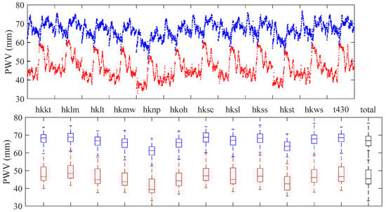 Scatter (upper) and boxplot (lower) of the observed PWV at each station during the period of rainless and rainy days. Blue for the rainy condition and red for the rainless condition.
