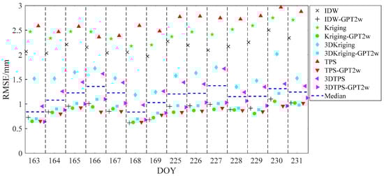 To further demonstrate the performance of different interpolation schemes, the RMSE of each day for station cross-validation is drawn in Figure 4, where the colors and symbols indicate the interpolation schemes. It is clear that the first set of schemes, i.e., IDW, Kriging, and TPS, performed the worst and had a larger RMSE, and the third set of schemes (3DKriging and 3DTPS) reduced the RMSE value due to the consideration of terrain elevation. With the addition of the GPT2w model, RMSE values were reduced again and the corresponding schemes achieved the best performance. The median value of all interpolation schemes on each day is also represented by the dotted blue line in each bin, which highlights the difference between the interpolation schemes. It separates the schemes by adding the GPT2w model from the schemes that are not added, showing the improvement of the GPT2w model for PWV interpolation. Additionally, as the figures of MAE and CRE are similar to the RMSE, they are not repeated here.