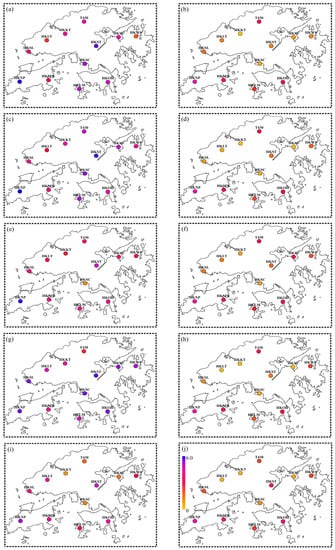 Map showing RMSE at the 12 stations for the 10 interpolation schemes in rainy weather condition. (a) IDW, (b) IDW-GPT2w, (c) Kriging, (d) Kriging-GPT2w, (e) 3DKriging, (f) 3DKriging-GPT2w, (g) TPS, (h) TPS-GPT2w, (i) 3DTPS, (j) 3DTPS-GPT2w.