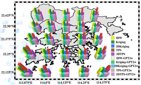 To intuitively display the interpolation results in the grid points validation, the histogram of RMSE at 25 grid points for the 10 interpolation schemes is shown in Figure 6. The five pillars in the south of each grid point, representing the schemes that added the GPT2w model, are shorter than the corresponding five pillars to the north, which indicates that the addition of the GPT2w model can improve the interpolation accuracy at all grid points. Some other trends are the same as those in Table 2. Moreover, it was found that all of the interpolation schemes performed slightly worse at the grid points at the boundary of the study area, which is related to their being away from the reference stations.