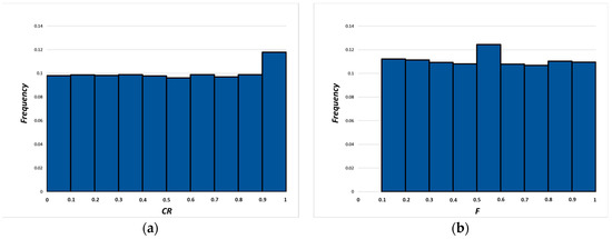 (a) The average value of crossover rate (CR) and (b) scaling factor (F) for 30 runs using jDE algorithm.