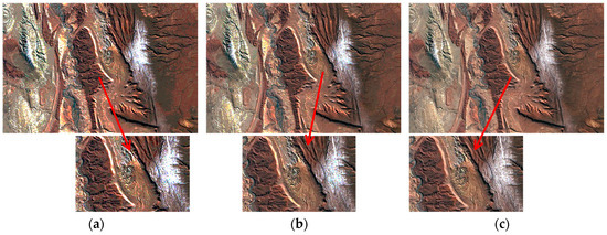 In addition, experiments were performed on eight satellite images (see Figure 4) to determine the optimal parameter settings of the proposed algorithm. The average rank with different combinations of and are given in Table 1. Note that the values of the parameters and are the initial values here. Other parameters, such as , , etc., are the same as in the original literature [49], in which the authors have discussed, in detail, the impact of the selected parameters on the performance. In this experiment, a lower ranking value indicates better performance. As can be observed, and present the best results in most cases; thus, this combination of parameter values was adopted in the following experiments.