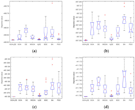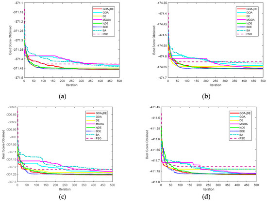 It can be found, from the two above formulations, that the cost of “objective function evaluation” is equal. However, the cost of “position update” is significantly different. Therefore, only the latter needed to be analyzed to assess the differences between them. In GOA–jDE, the population is divided into two parts according to the average fitness value, while the computational complexity of these two parts is different. Mutation, crossover, and selection operations are the main costs of jDE, and the computational complexity is approximately equal to . For the position update using GOA, the computational complexity is approximately equal to , since each grasshopper needs to compute its social interaction, while the calculation of the distance between two individuals is essential, as shown in Equation (2). Similarly, in the GOA algorithm, the cost of the position update is equal to , which can be rewritten as . It can be seen from the final versions of Equation (10) and Equation (11) that they all contain three terms representing the cost of position update. Obviously, the first two terms of GOA–jDE cost less than the standard GOA. Considering the third term, it is difficult to determine which algorithm has higher computational complexity due to the unknown cost of crossover and selection operations represented by and , respectively. In fact, the computational complexity of GOA–jDE is much lower than the standard GOA, which will be verified in subsequent experiments.