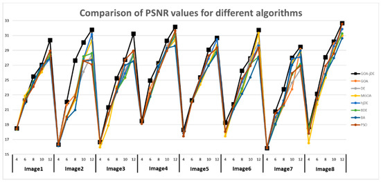 In this section, the performance of the proposed algorithm is further verified on the SIPI Image Database (37 color satellite images and 1 grayscale satellite image). The experiment was carried out at high threshold levels, which are the same as in Section 5.4. Note that the compared selected algorithms are based on different criteria, thus, the PSNR, SSIM, and FSIM indicators are utilized instead of average fitness values.