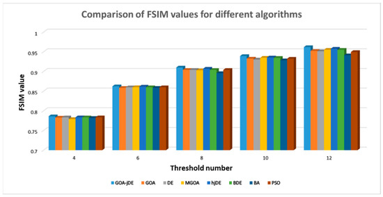 Additionally, the computational complexity of thresholding technique above will result in exponential growth as the number of thresholds increase. In this case, the basic MCE multilevel thresholding method is not very effective. Thus, the GOA–jDE-based method using MCE is proposed with the purpose of reducing computational complexity and improving segmentation precision. In other words, the GOA–jDE algorithm is used to optimize the objective function given in Equation (4).