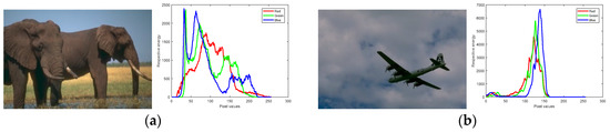 Two natural images from the Berkeley segmentation dataset, which are named ‘Elephant’, and ‘Plane’, respectively, and the corresponding histograms for each of the color channels (red, green, and blue). (a) Elephant (481 × 321), (b) Plane (481 × 321).