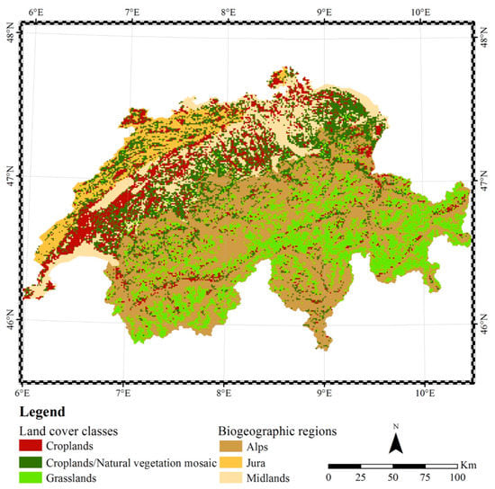 Switzerland is divided into biogeographic regions according to flora and fauna patterns [39], (Figure 1). The Midlands are intensively managed with agricultural land use, covering ca. 50% of the area [40]. This is a heterogeneous floristic region with an altitudinal range between 256 m and 960 m a.s.l. [41]. The land cover class croplands mainly cover the Midlands (Figure 1). The altitudinal gradient impacts climatic patterns and management practices. High intensity of use occurs at altitudes lower than 1000 m a.s.l., and extensive management practices are frequent above this elevation [42,43]. In the Alps, pastures co-exist with extensively managed meadows with low yields and high plant species diversity [44,45]. The land cover class grasslands are mostly located in this area (Figure 1). Silvopastoral systems (mosaic of open grasslands, closed forest, and woody pastures) are characteristic of the Jura mountains, with diverse management practices adapted to local conditions, such as cattle stocking and logging [46,47,48]. The land cover class croplands/natural vegetation mosaic mostly covers this region (Figure 1).
