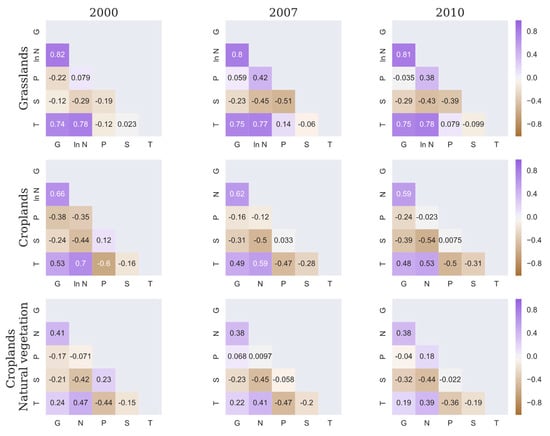 Correlation matrix between the dependent and independent variables per year and land cover class (p < 0.01 mostly, see Appendix A, Table A1, Table A2 and Table A3). G: GPP, N: N deposition, ln N: natural logarithm of N deposition, P: Precipitation, S: Sunshine, and T: Temperature.