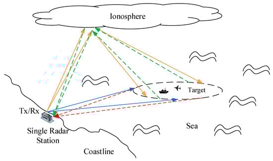 High-frequency (HF) over-the-horizon radar (OTHR) has been successfully developed for target monitoring and ocean remote sensing by transmitting HF vertical polarization electromagnetic wave working at 3–30 MHz [,,,]. HF mixed-mode surface wave radar (MMSWR) is a new kind of monostatic high-frequency surface wave radar (HFSWR). The new propagation mode utilizes the echoes received from both surface-wave path and sky-wave path to obtain more information than a conventional monostatic HFSWR system. The diffuse scattering characteristic of targets makes it possible that a portion of echoes radiation will be reflected to the ionosphere. Under certain propagation conditions, including the range of the target, the ionosphere height and the reflection angle, this portion of radiation can be received by the antennas after a second reflection by ionosphere. This constitutes a multipath propagation model. Zhao et al. [] presented a multipath propagation model for echo signals of islands to calculate the height of ionosphere. The echo signals of islands have two possible paths, the traditional ocean path where both the transmitted and received signal is via the surface wave, and the ocean-ionosphere path where the transmitted signal is via the surface wave and the reflected signal is received via the skywave path. Utilizing the same propagation model, a target track matching method is presented based on the multipath echoes by Zhang et al. []. A modified multimode target tracker is proposed to deal with the target tracking problem in mixed propagation mode []. The advantages of the mixed propagation mode compared with the conventional HFSWR, are that more target information can be obtained due to additional propagation paths and the detection range can be extended for HFSWR owing to the ionosphere propagation path. Therefore, these features have drawn increasing attention to the new HF MMSWR.