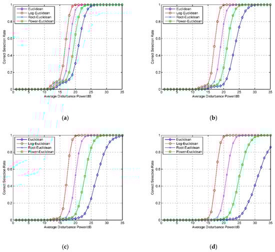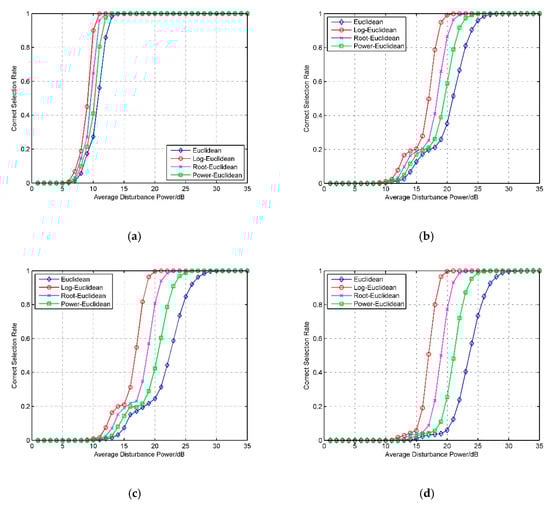 Firstly, we do the performance analysis against average disturbance power with different numbers of disturbances. The simulation conditions are that N = 8 , K = 100 , Ω = 30 , σ c 2 = 15 dB, ρ = 0.95 , f d c = 0.20 , p 0 = 1 , the number of Monte Carlo simulation is 5000, the normalized Doppler frequency of the first set of disturbances belongs to { f d o , 1 } { 0.15 ± 0.01 } and the second set is set to be { f d o , 2 } { 0.25 ± 0.01 } . The power of each disturbance is assumed equal. Figure 4 shows the selection performance when the total number of disturbances N d i s t u r b a n c e are 6, 8, 10, and 12, respectively. Figure 4 shows that the Log-Euclidean distance-based training data selector has the best performance and selects the most homogeneous training data among the different disturbances. This result agrees with the conclusions by Aubry et al. [] and Cui et al. []. This shows that the Log-Euclidean estimator outperforms other geometric barycenter estimators in different conditions, for both target detection processing and clutter suppression processing. As the number of the disturbance increases, which is from 6 to 12 in (a) to (d), respectively, the correct selection rate decreases as it was expected. This implies that the first-order sea clutter in the practical situation suffers more ionospheric disturbances which makes the clutter statistical property more heterogeneous. Therefore, the correct selection becomes more difficult. But even in this scenario, the Log-Euclidean selector shows greater robustness than the others, especially the Euclidean selector.