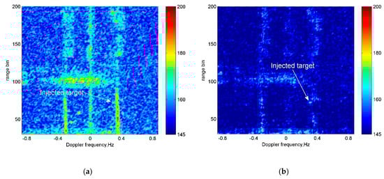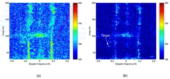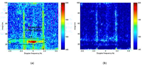 Figure 6a,b show the range-Doppler map of the digital beam forming (DBF) method and the Log-Euclidean JDL (LE-JDL) method with the injected target respectively. It shows that the first-order sea clutter has been suppressed to a large extend as compared with the DBF method. But the spread ionospheric clutter in about 100 range bins remain pretty strong which will still make it difficult to detect the targets around this region. The ionospheric clutter suppression is discussed in the following subsection.