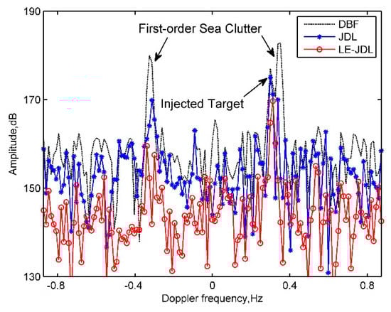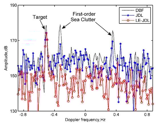 Figure 8 shows the clutter suppression result with the target in the range-Doppler map. Figure 8a is the range-Doppler map of the DBF process as the comparison and Figure 8b is the result of the proposed LE-JDL method. From the figures, we can see clearly that the proposed method is very powerful to suppress the first-order sea clutter in the non-stationary background environment.