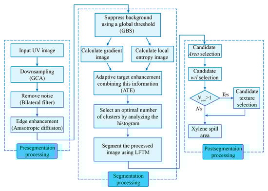 The main contribution of our work is to propose a method for distinguishing the spill areas of transparent liquid chemicals floating on water. In this section, we introduce all the processing steps of our method. The UV images are processed using the workflow illustrated in Figure 1.