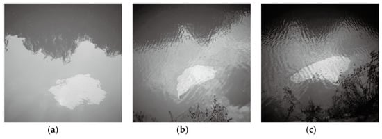 We acquired xylene spill images by performing an outdoor experiment to investigate xylene spills under clear sky conditions. The experiment was carried out at an artificial channel on the campus of Ocean College at Zhejiang University in Zhoushan, Zhejiang, China. The wind speed was 2–3 m/s. Xylene is one of the top 10 chemicals that is likely to pose the highest risk of being involved in an HNS incident, and it is a typical benzene series. The xylene that was used in our experiment was produced by Aladdin, Shanghai. Approximately 30 mL of xylene was released into the channel each time. A hand-held digital camera (a6000, Sony, Japan) equipped with an ultraviolet narrow bandpass filter (365 nm) with an observation angle ~30 from the zenith and ~5 m away from the xylene spill targets was used to capture the UV images under different scenarios, including shadows, waves, and sun reflections. The camera has a 16–50 mm Sony lens, generates an 8-bit gray level image with a resolution of 4000 × 4000, and covers a scope of approximately 6 × 6 m2 in one shoot. The exposure time is 1/50 s. The UV images were taken 30 s after all the xylene was dispensed, thus allowing enough time for the liquid spills to stabilize. We conducted this experiment with full protection and cleaned up all chemicals following Regulation on the Safety Management of Hazardous Chemicals [].