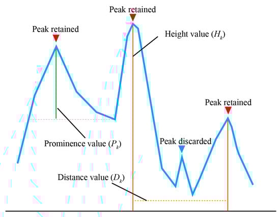 (3) Calculate the prominence values Pk from the candidate maxima. The prominence value is the minimum vertical distance that the signal must descend on either side of the peak before either climbing back to a level higher than the peak or reaching an endpoint. Set the prominence threshold th4 = 75.