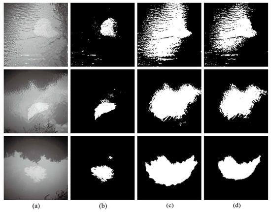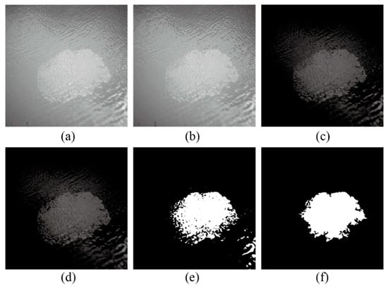 To compensate for the information loss caused by the smoothing operation, we choose the anisotropic diffusion algorithm to enhance the saliency of the spill region’s boundaries and suppress the weak edges and small structures inside the background []. Figure 3 demonstrates the effect of the pre-segmentation processing. With the help of the GCA, bilateral filter and anisotropic diffusion operation, the image noise and small unwanted objects are discarded, and the target boundaries are enhanced.