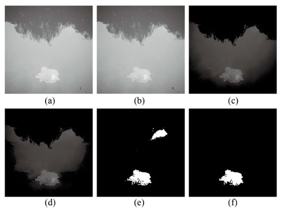 In Figure 9, the spill target in the original UV image looks like a small bright spot with a vaguely visible outline while the top of the water background is covered by shadows, and the low part has a similar gray value to the target area. Figure 9b shows the result after the preprocessing with the decreased resolution. Figure 9c,d are the results of the GBS and ATE, respectively. The optimal number of clusters was automatically set to 4 by analyzing the histogram information of Figure 9d. Figure 9e shows the segmentation results after the LFTM (cluster number = 4). Figure 9f shows the final segmented spill target after postprocessing. It is obvious that GBS and ATE do suppress the background interference and enhance the target area. The LFTM helps us to segment candidate target regions from the processed images. Then, with the evaluation of the LFTM-proposed candidates, we finally distinguished the correct spill target from the background.