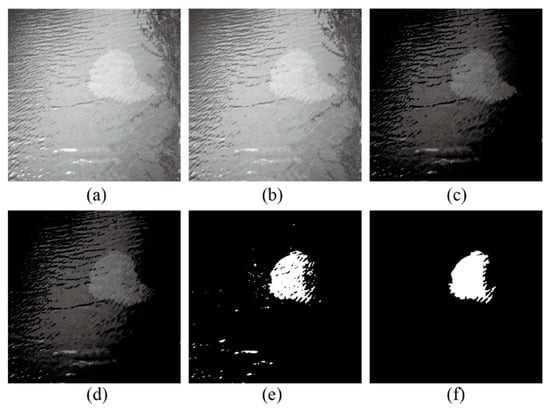 Figure 11 shows the processing sequence that was applied to a UV image under uneven illumination with water ripples and shrub branches. In Figure 11a, we can see that the spill target is in the right middle of the image and is surrounded by a bright background. Figure 11b is the result after preprocessing. After GBS and ATE are applied, the difference between the target region and the surrounding environment becomes detectable, as shown in Figure 11c,d. After cluster number analysis, it is reasonable to divide the picture into four clusters, i.e., cluster number is set to 4. The LFTM segmentation result is shown in Figure 11e. The post-segmentation processing discards the background noise and selects the right target. The final segmentation result is demonstrated in Figure 11f. The shape of the right edge corresponds with the edge of the shadow at the right side of the spill. This may be the reason that these pixels were misclassified.