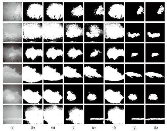 Comparison results. (a) Original image; (b) Otsu; (c) Max entropy; (d) LFTM with Ncluster = 3; (e) LFTM with Ncluster = 3; (f) Chan–Vese active contour model (CV model); (g) our method; and (h) ground-truth.