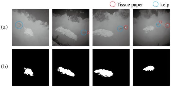 It is necessary to study the influence of interferents on the approach. We captured 20 UV images with tissue paper and kelp by the camera described in Section 3.1 and applied our method on these images. AC, PR, RE, and F1 of 0.9686, 0.8891, 0.6812, and 0.7578, respectively, were obtained for our method. Examples of segmentation results are shown in Figure 13. When the interferent is small, e.g., the tissue paper or its gray value is low in the UV band, the proposed method can recognize the true target. Our method gets F1 score of 0.7575, which is better than 0.2917 when using original LFTM with Ncluster = 3, and 0.3704 when using original LFTM with Ncluster = 4, while indicator of RE is slightly lower than the other two methods. The edge of some targets is blurred due to the fast movement of chemical spill. This could cause error in the step of ATE resulting in relatively lower RE and F1 scores.