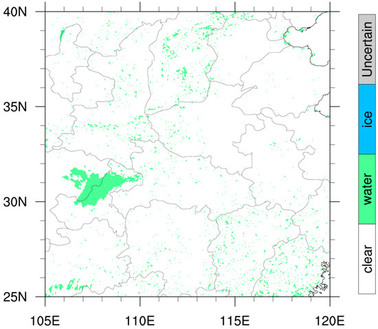 Another is under real atmospheric conditions. The simulations of brightness temperatures at TOA by AMCKD are compared to the observation results from the Advanced Himawari Imager (AHI) on board Himawari-8 and Medium Resolution Spectral Imager (MERSI) on board Fengyun-3D. The simulated area is 105° E–120° E with 25° N–40° N on December 20, 2017, at 6:00 UTC. The atmospheric input profile (atmospheric pressure, temperature, specific humidity, and ozone mass mixing ratio) are from the ERA-Interim reanalysis data [28,29,30]. As shown in Figure 2, there are only a few clouds in the considered area. We remove the cloudy area in the following calculation for focusing only on the gaseous transmission. The aerosol is not considered, because the aerosol infrared forcing is very weak, about one order of magnitude smaller than that in the solar spectral range.